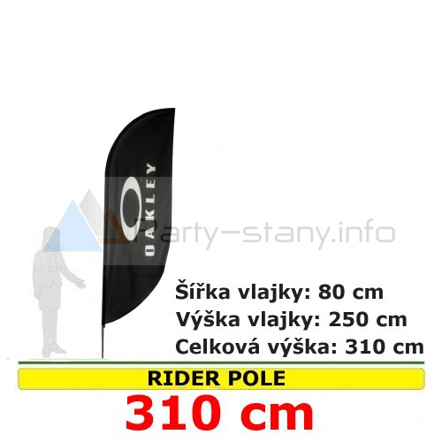 Cenu vlajek Rider pole 310 cm obsahuje 100% hyper - sublimační tisk dle vlastního výběru. Tunel a připevnění ke stožáru.